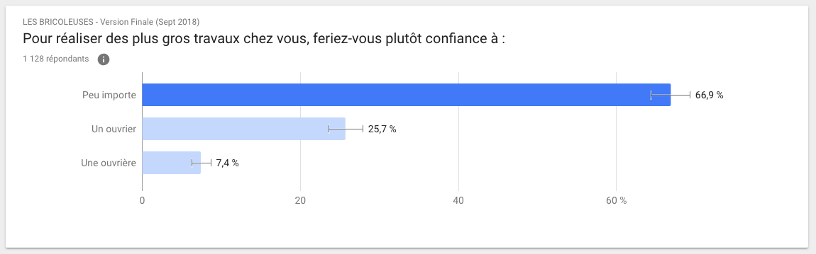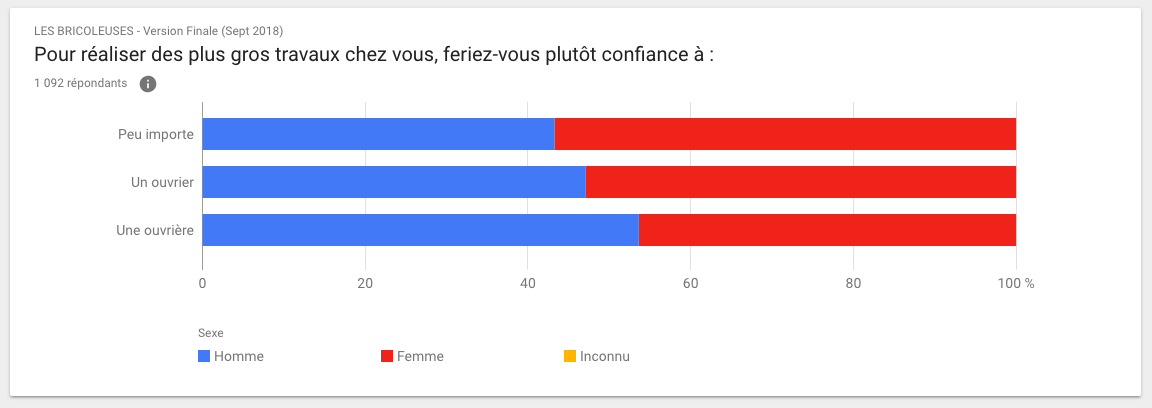 Cela mérite d'être répété : 3 Français.e.s sur 4 disent ne pas accorder d’importance au sexe de la personne qui viendra faire des travaux chez eux. Ils sont donc plus de 77 % a accepter l’idée qu’une femme puisse faire "un métier d’homme".