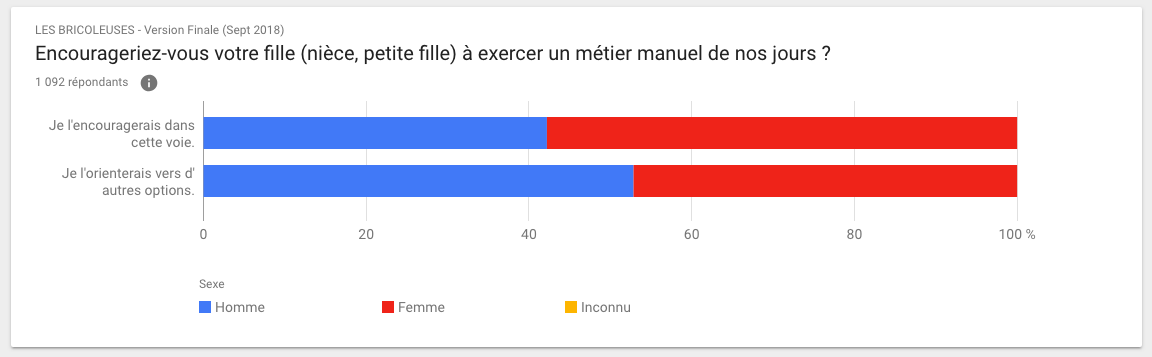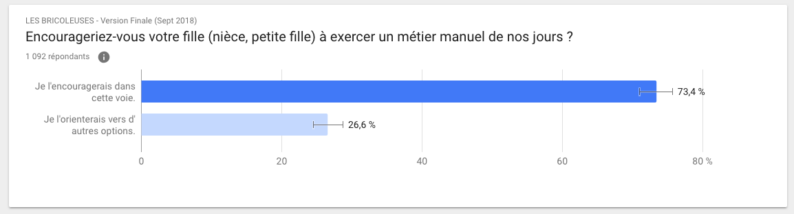 D'ailleurs, 73,4 % des personnes interrogées affirment qu’elles encourageraient leur fille, nièce, etc... à exercer un métier manuel aujourd’hui.